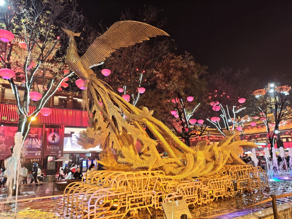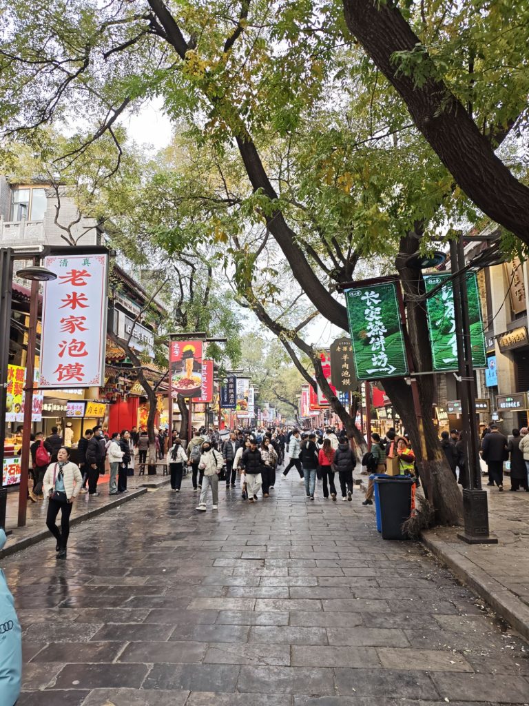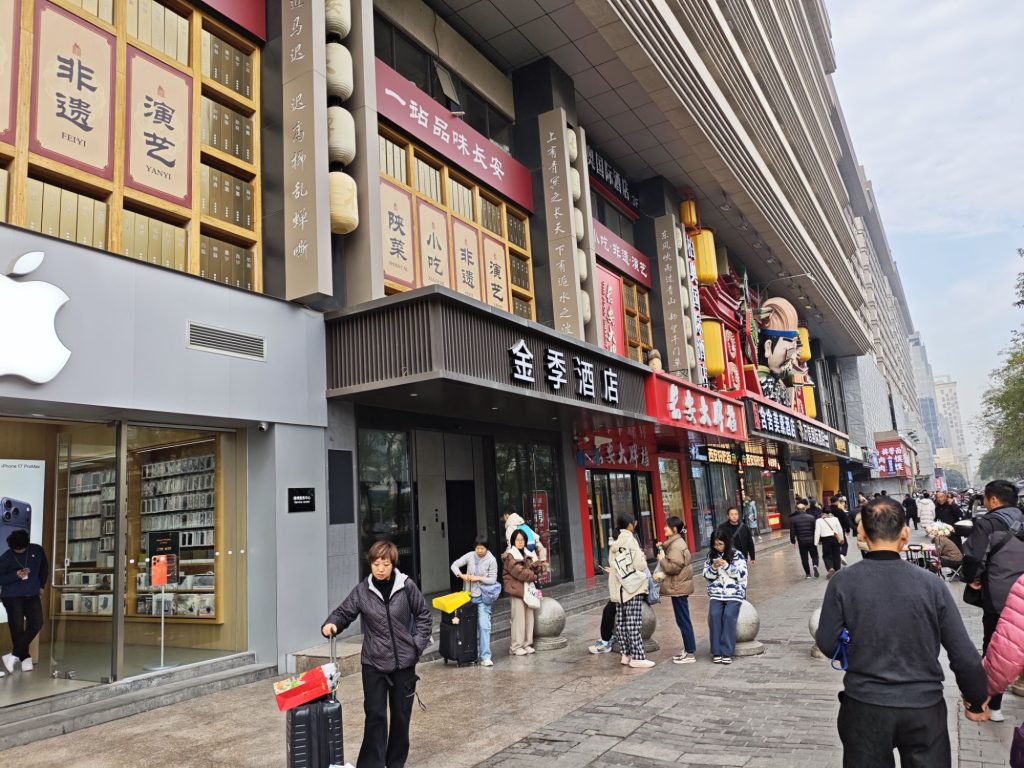 拍完选好照片、回店卸妆,已经六点半。在酒店对面的饭店吃了顿山西菜,接着坐地铁去大唐不夜城。从大雁塔地铁站走到步行街入口,花了十五分钟。在步行街打了卡、看了表演,一天走下来两万步,我累得腿都抬不动,本想回去,却见前面人头攒动——原来是不倒翁小姐姐表演的地方。一家人赶紧挤进去看,虽然表演已近尾声、演员准备撤了,但总算见到了真人,也算没白来。
