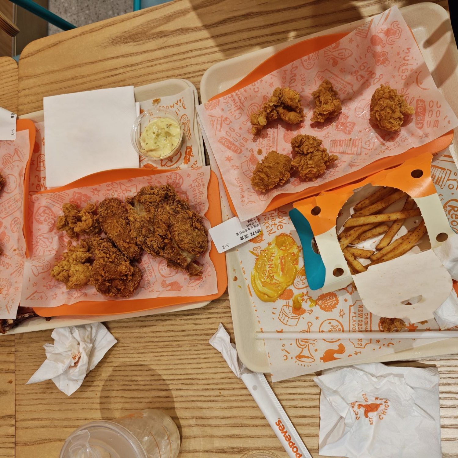 1月2日,晚上一个人在家带娃,晚饭没咋吃肉,就骑着电驴去了世纪大道的Popeyes尝尝。点了个小食套餐,鸡柳味道还凑合,感觉还行,当然价格也不便宜。1月6日,上周六晚上不知道吃啥,就带着老婆和娃去了家附近的Popeyes吃饭。虽是快餐,但出餐要等半小时,气得半死。最后餐品质量也很一般,这20多的鸡柳性价比确实不高,以后再也不会想去这家店了。